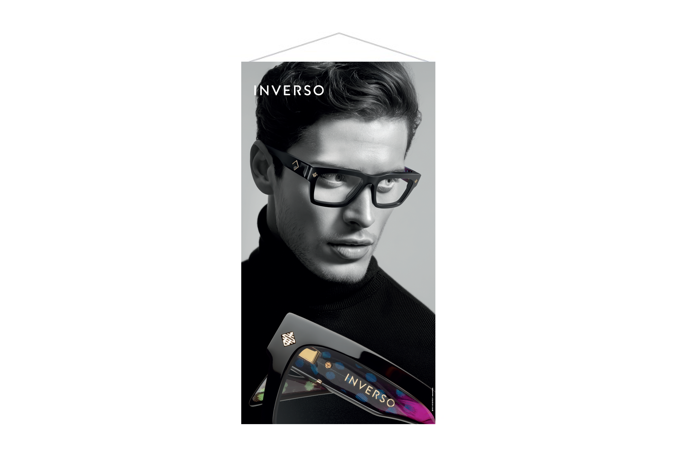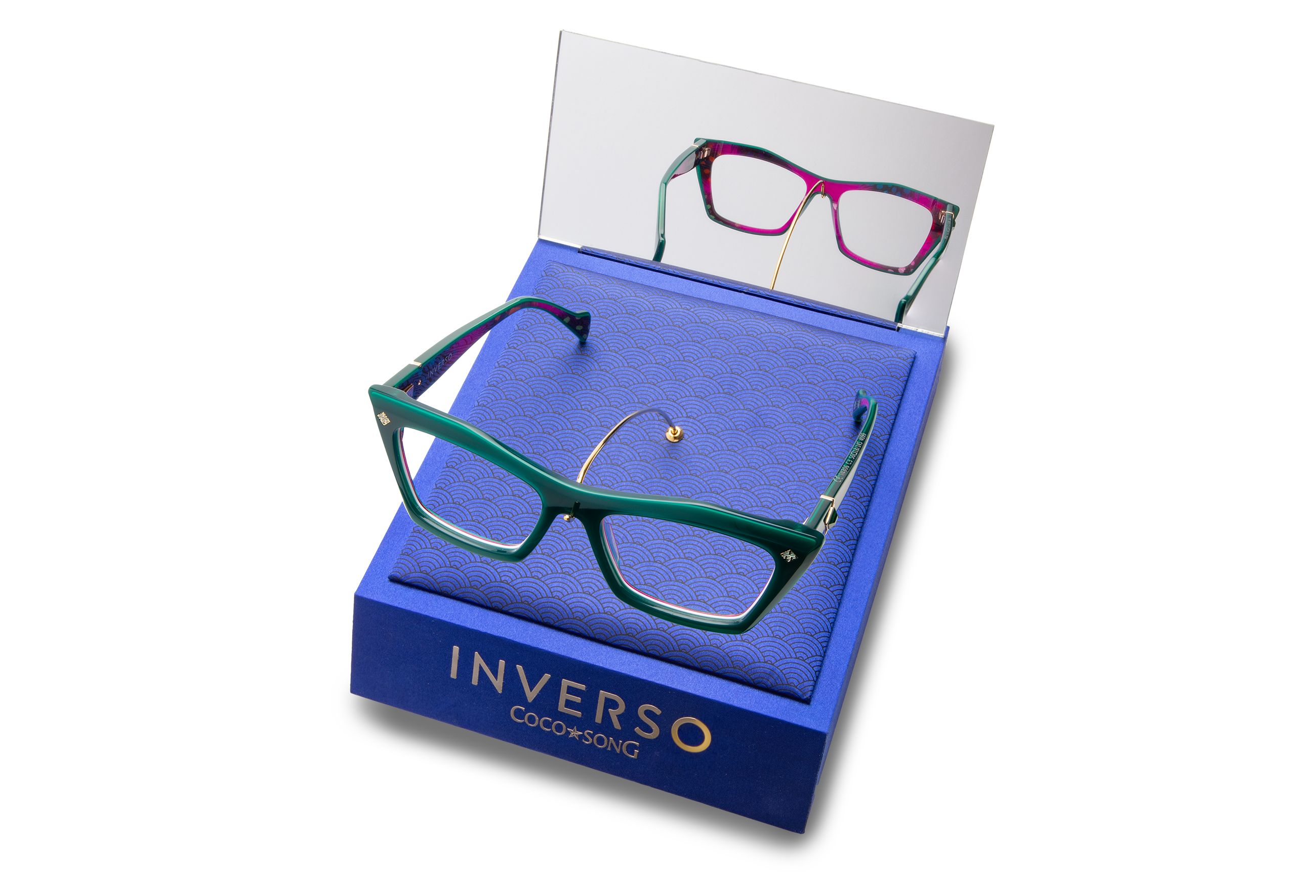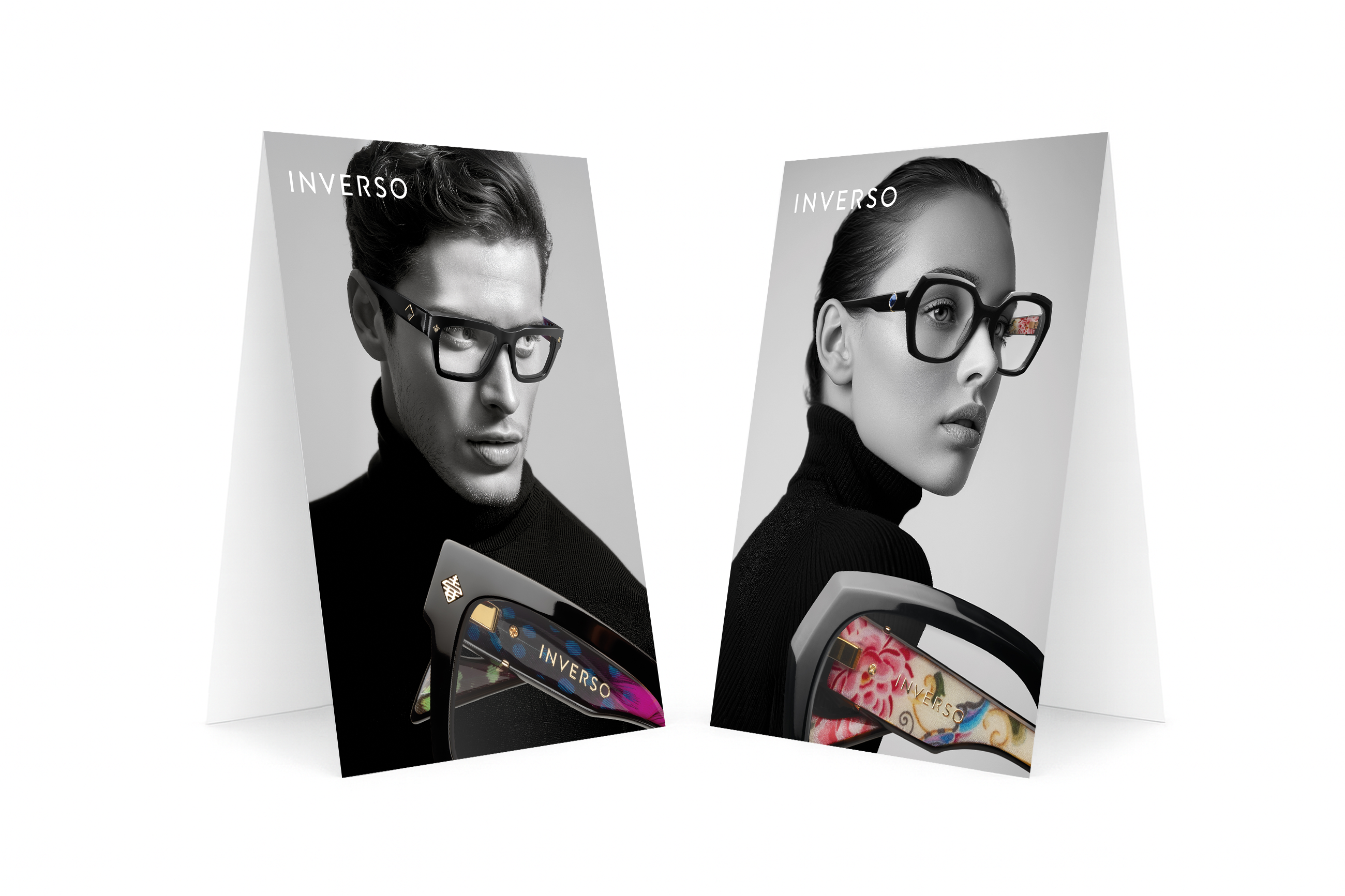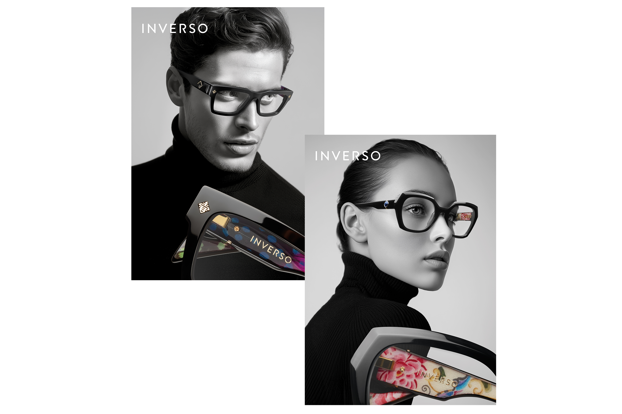 Inverso was created to redefine the concept of eyewear, transforming it into a true experience of style and innovation. On the outside, minimalist lines and clean surfaces; on the inside, surprising details: feathers, flowers, and silk intertwine to create unique compositions, revealing a hidden richness that unfolds only to those who look closer.